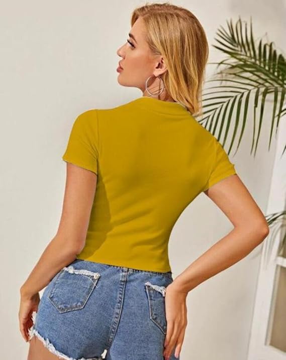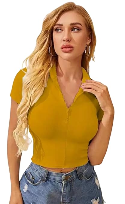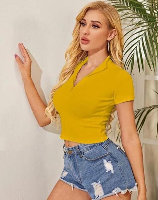 Women Collar V-Neck Mustard Yellow Crop Top.