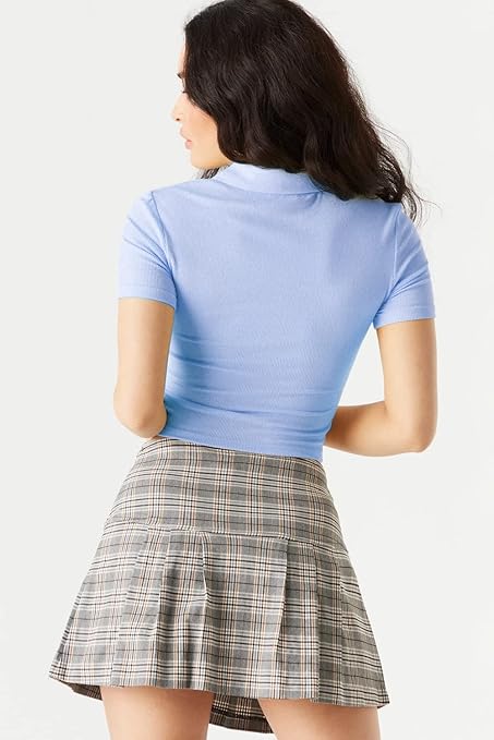 Women Ribbed Button Up Blue Crop Top.